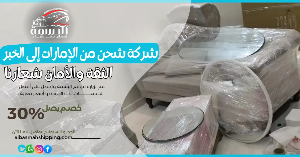 شحن الأثاث من الإمارات إلى الخبر يتطلب عناية فائقة. شركة شحن من الإمارات إلى الخبر البسمه تقدم خدمات فك، تغليف، ونقل احترافية لضمان وصول الأثاث بحالة ممتازة.