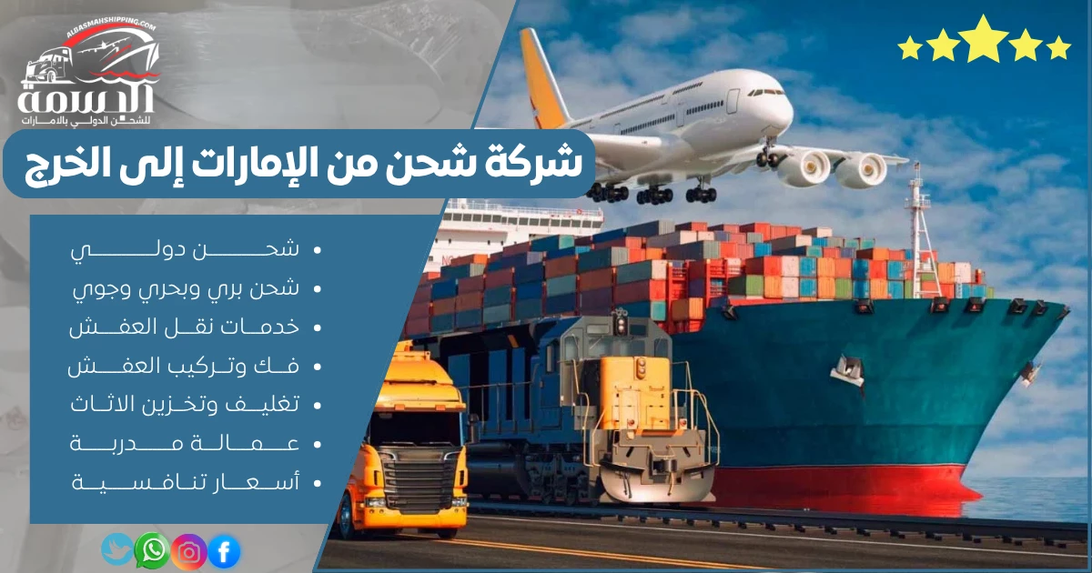 تتميز شركة شحن من الإمارات إلى الخرج البسمه للشحن الدولي، بخدمات شحن شاملة وموثوقة تلبي احتياجات الأفراد والشركات. مع شعار “من الباب للباب… شحنك في أيد أمينة مع البسمه” ، نقدم حلول شحن بري، جوي، وبحري تضمن السرعة، الأمان، ورضا العملاء. في التالي سنستعرض خدمات البسمه للشحن، مزاياها، وكيفية تميزها في نقل العفش، البضائع، والطرود من الإمارات إلى الخرج.
