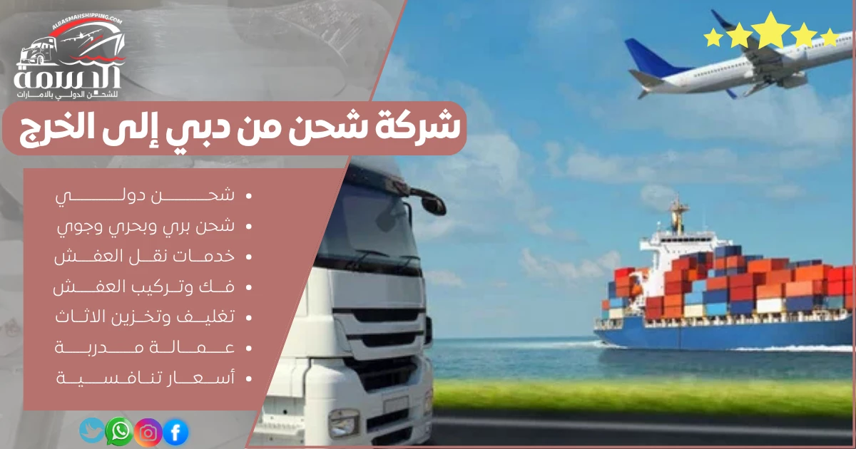 تتألق شركة شحن من دبي إلى الخرج البسمه للشحن الدولي، كخيار رائد لنقل العفش، الأثاث، البضائع، والطرود بكفاءة وأمان. مع شعار “البسمه للشحن… نختصر المسافة من دبي للخرج” ، نقدم خدمات شحن بري، جوي، وبحري تلبي احتياجات الأفراد والشركات. في التالي سنستعرض خدمات البسمه، مميزاتها، وكيفية تميزها في تقديم تجربة شحن موثوقة وسريعة.
